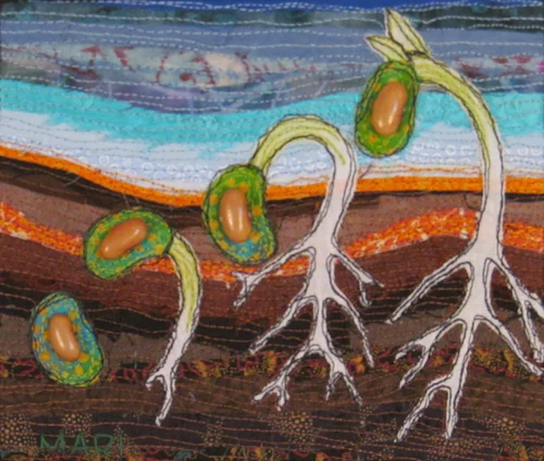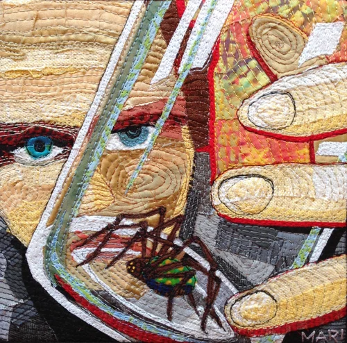 This ongoing series is all small format work, (approximately 7” by 7”). The images are free motion machine stitched onto whole or pieced cotton cloth.